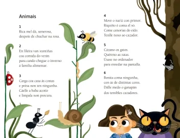 Animais, elementos da natureza, froitas, xoguetes, materiais para a escola, profesións, contos tradicionais e festas escolares. Entre estas oito seccións repártese o cento de ocorrentes adiviñas que completan este libro. Unha manchea de textos sinxelos para poñer a proba a perspicacia dos cativos e enriquecer o seu vocabulario.