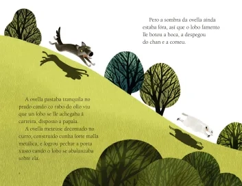 A sombra do elefante é moi voluminosa, a do pavón abondo delicada, a da tartaruga atrásase, a do camaleón cambia de cor, e como esvara a do golfiño! Todos os animais queren axudar a ovella á que o lobo lle comeu a sombra a atopar outra que poida substituír a súa. Aínda que a tarefa é laboriosa, por sorte sempre hai un traxe á medida de cada un.